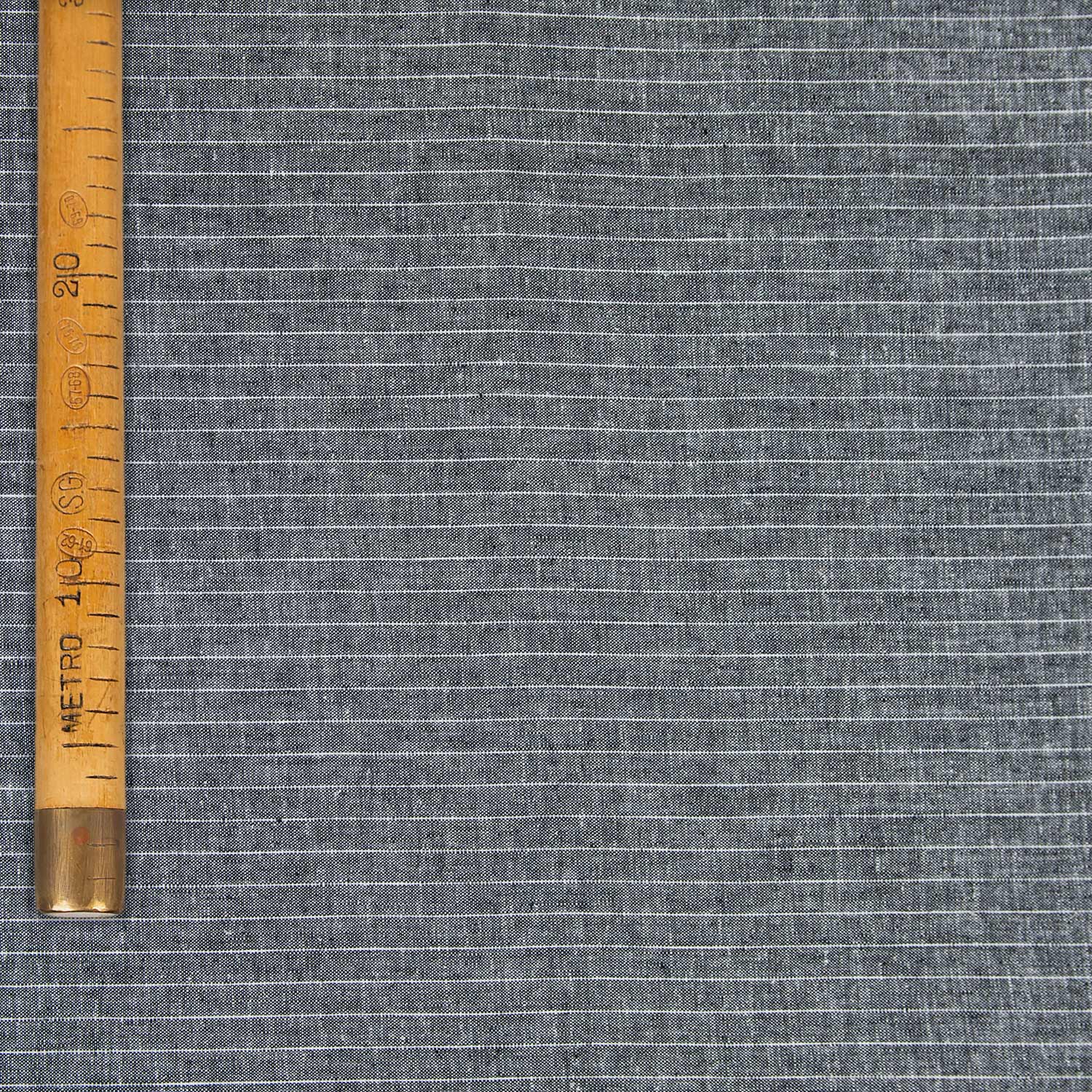 Pinstriped chambray in 60% linen, 40% cotton. It's a plain-weave fabric composed of colored yarns in the warp and white yarns in the weft, creating a melange effect. Its name comes from the French town of Chambray, where it was originally produced; its production was limited to dark shades, intended for use in work uniforms, so the dark colors could easily hide dirt and stains. This pinstriped fabric lends a simple yet refined allure, fresh and pleasant, making it ideal for creating casual garments such as men's and women's shirts, skirts, and children's clothing.