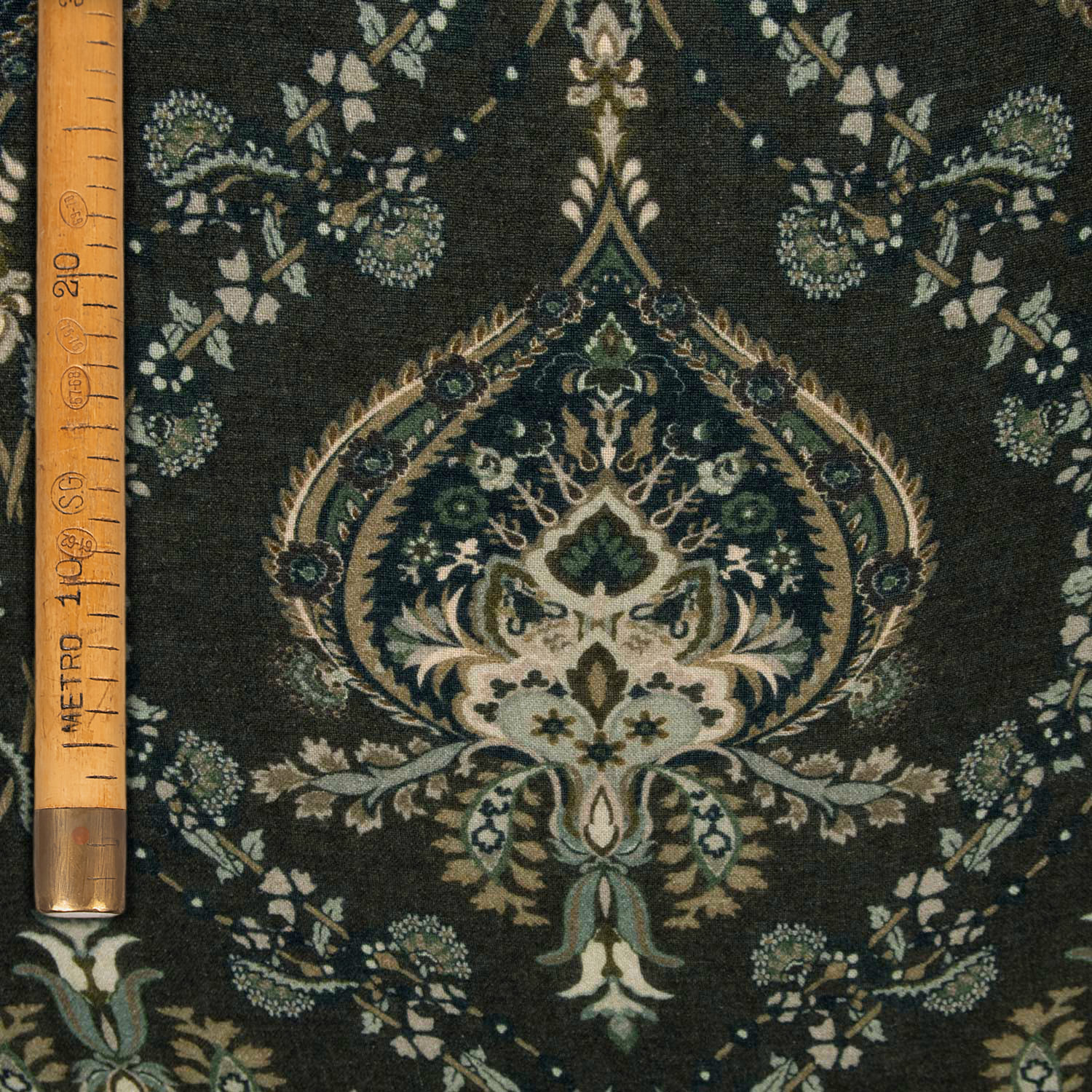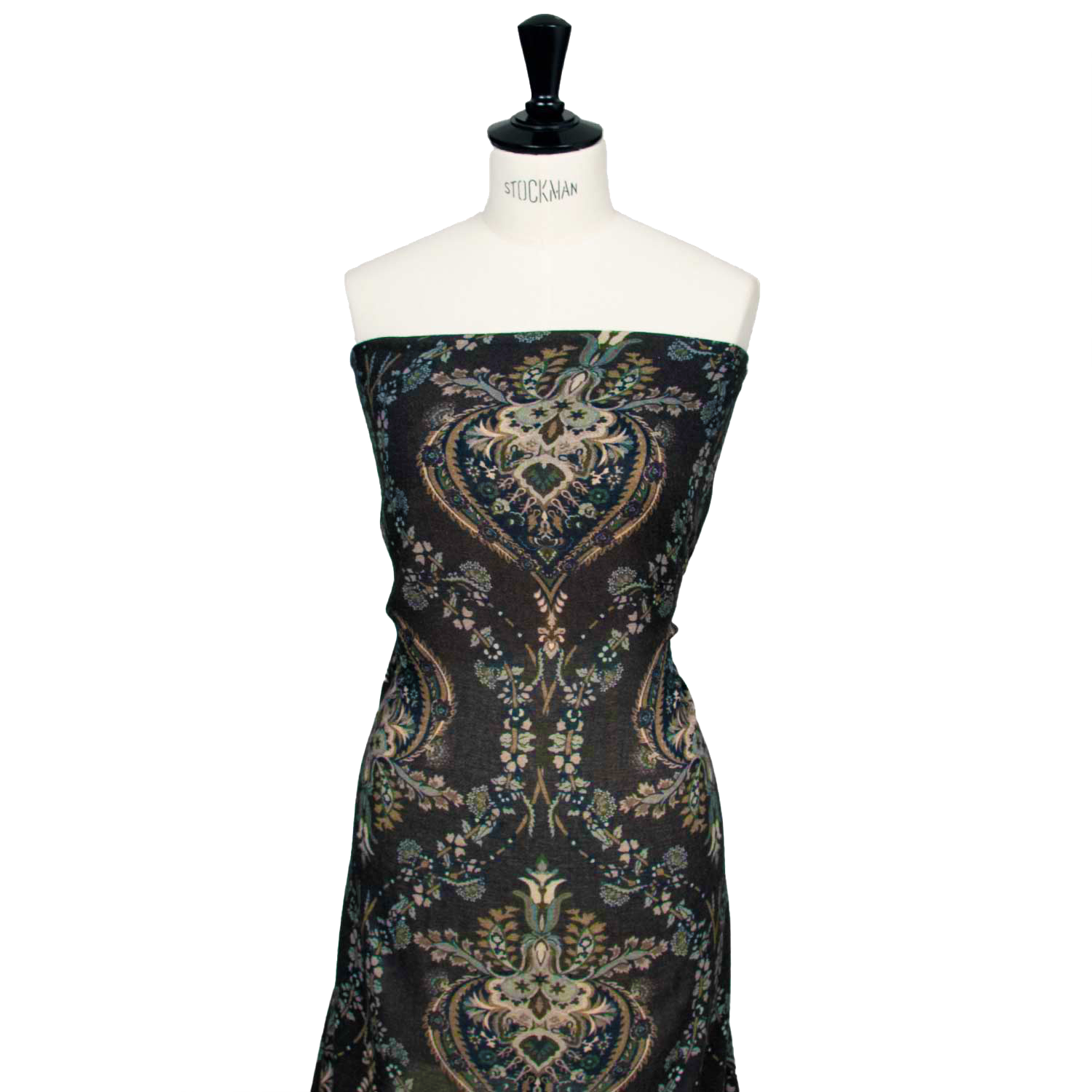 This wool and viscose gauze blends lightness and elegance in a print of striking visual appeal. The deep, dark base hosts a floral damask motif in refined tones of beige, sage grey, and ivory—recalling oriental atmospheres and antique ornamentation with a contemporary flair.