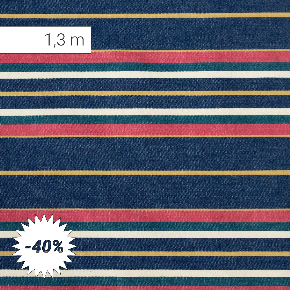 Eleganza distintiva per questo Denim Regimental riga irregolare ocra, corallo, verde e panna su denim blu, con un peso ideale per jeans e giacche... puoi creare anche qualcosa per la tua casa.